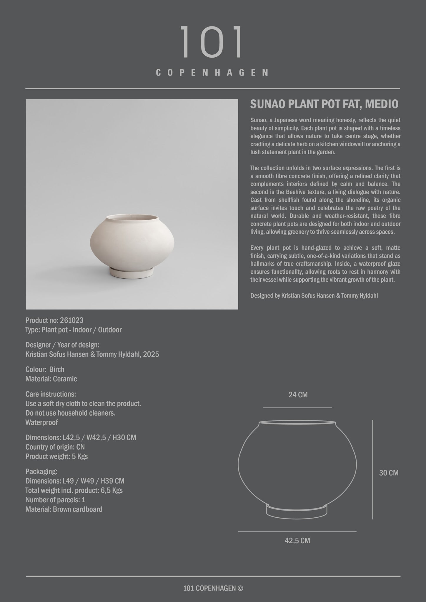 Finished in Birch, a bright, pale natural beige with a soft warmth, the surface is hand-painted, creating subtle variations in tone and texture. These natural differences ensure each planter is unique. Placed in a garden, on a patio, or within a spacious interior, the Sunao Plant Pot Fat, Medio offers a calm, sculptural presence that balances practical function with refined simplicity.