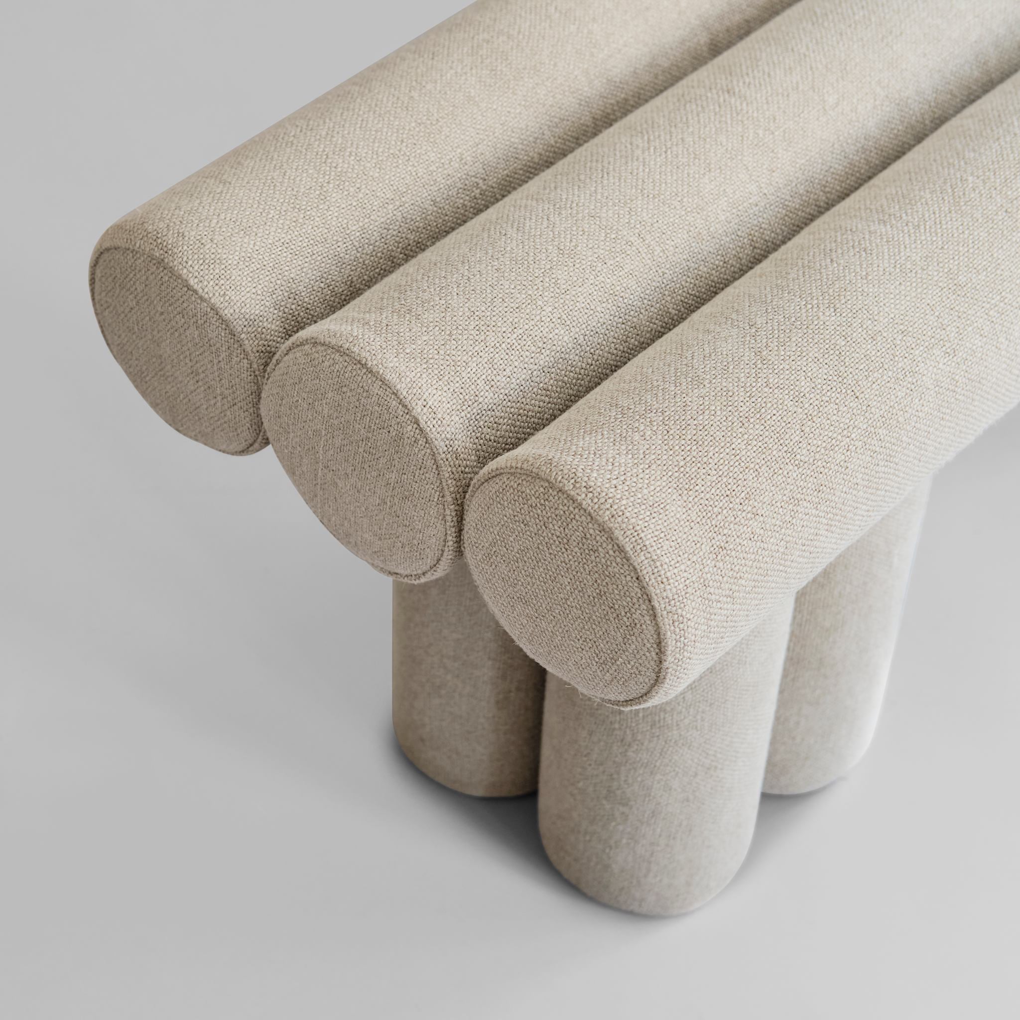 Three cylindrical metal legs form a stable, architectural base, while three upholstered cylinders create the seat above, establishing a rhythmic interplay between structure and comfort. A single upholstered backrest completes the composition, providing gentle support while acting as a subtle handle that invites movement and adaptability.